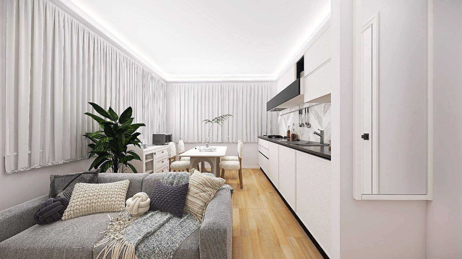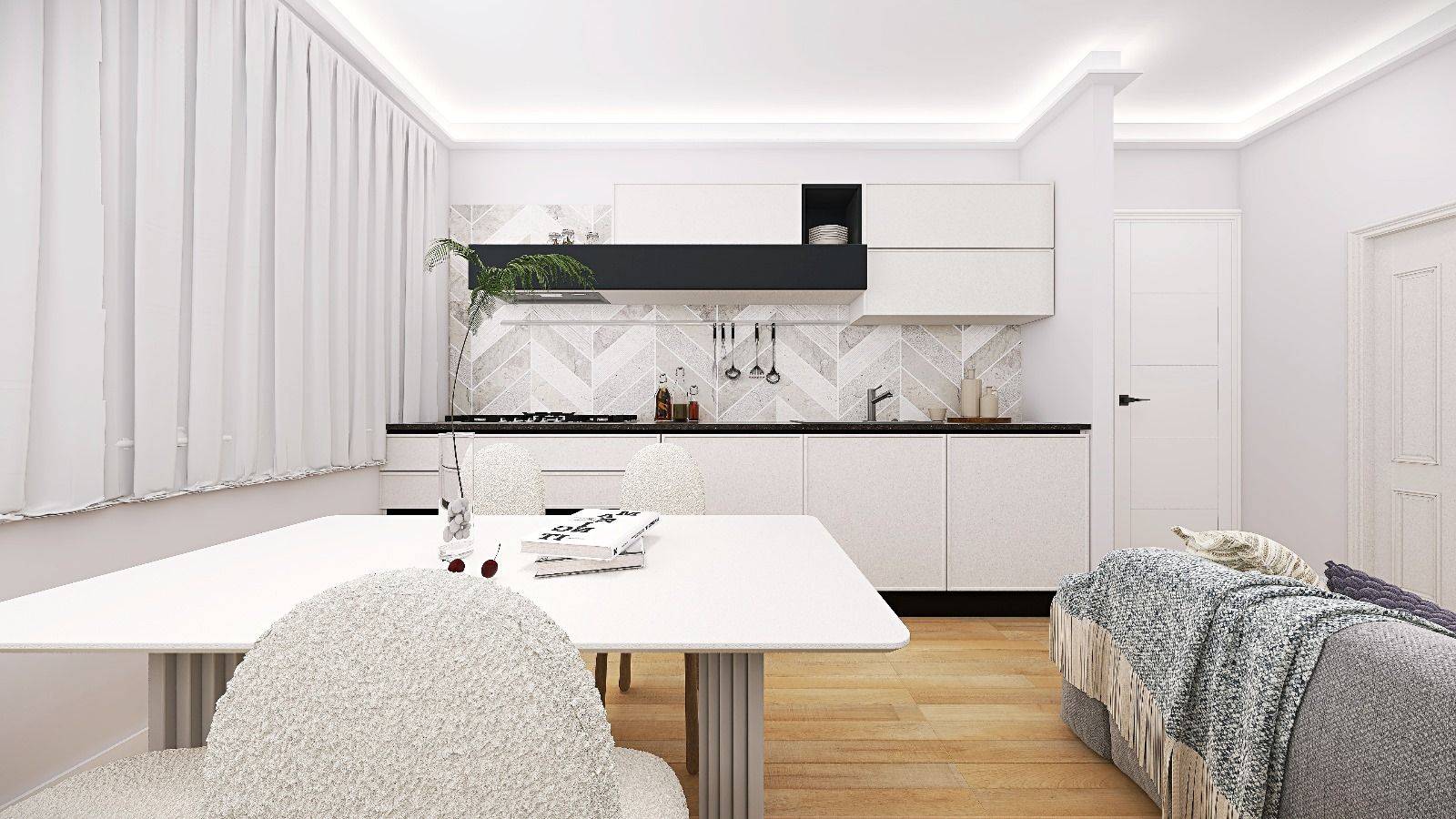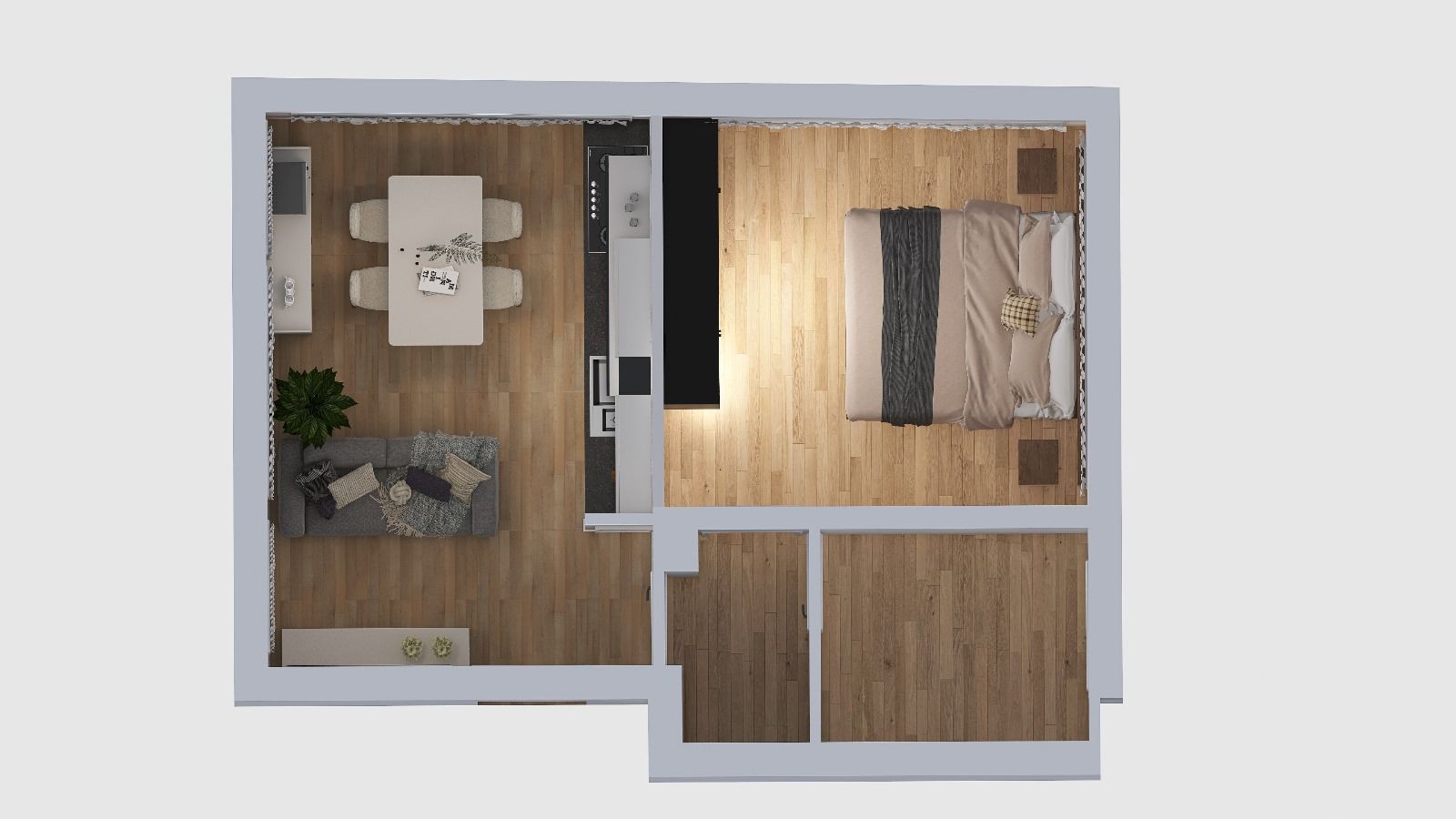 L'appartamento è composto da soggiorno con cucina a vista, camera matrimoniale e bagno.