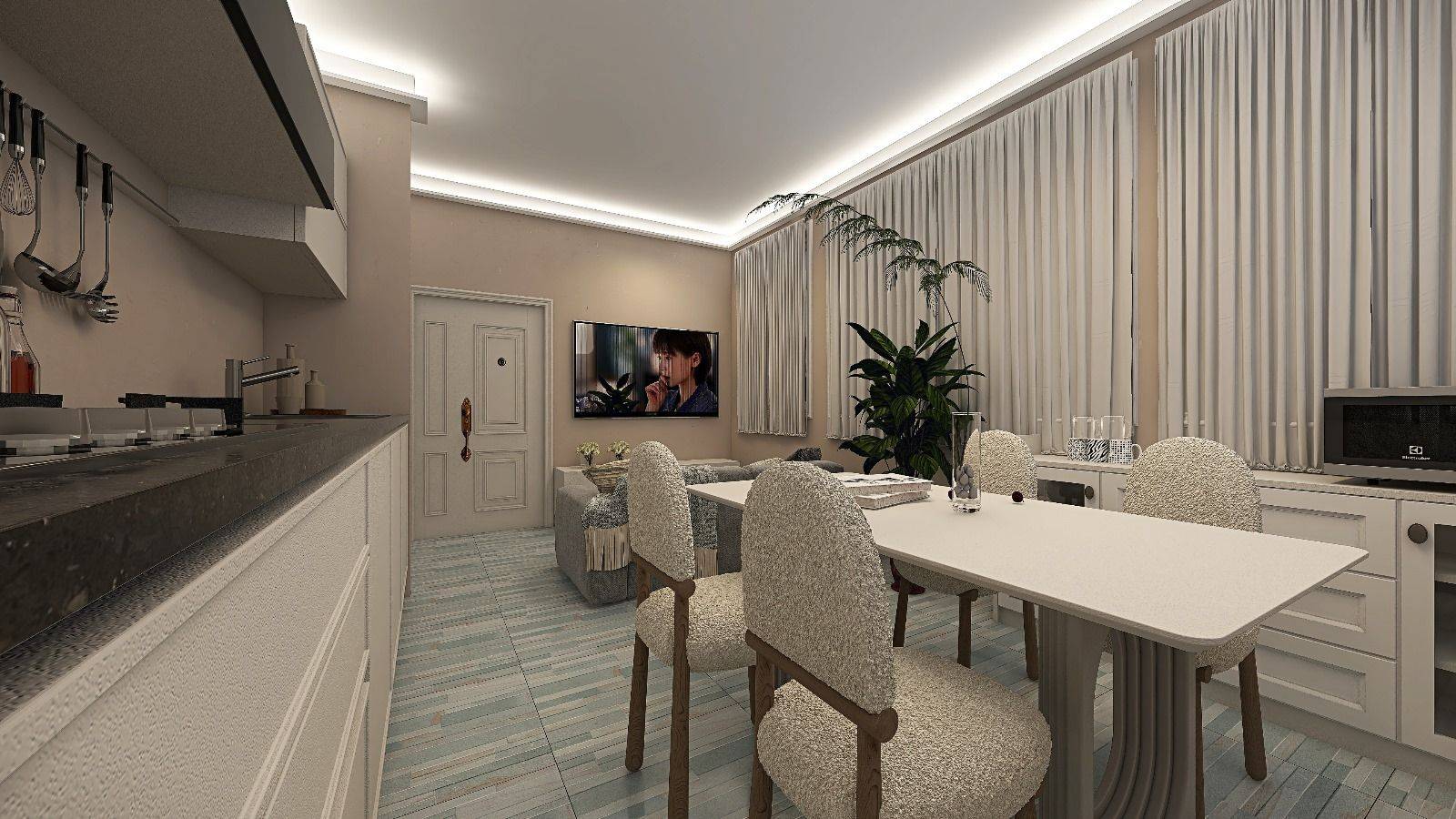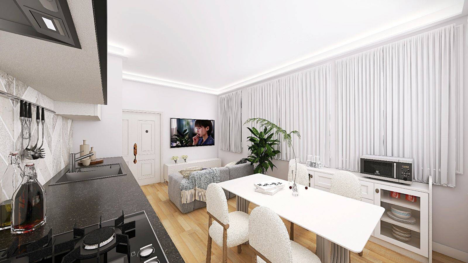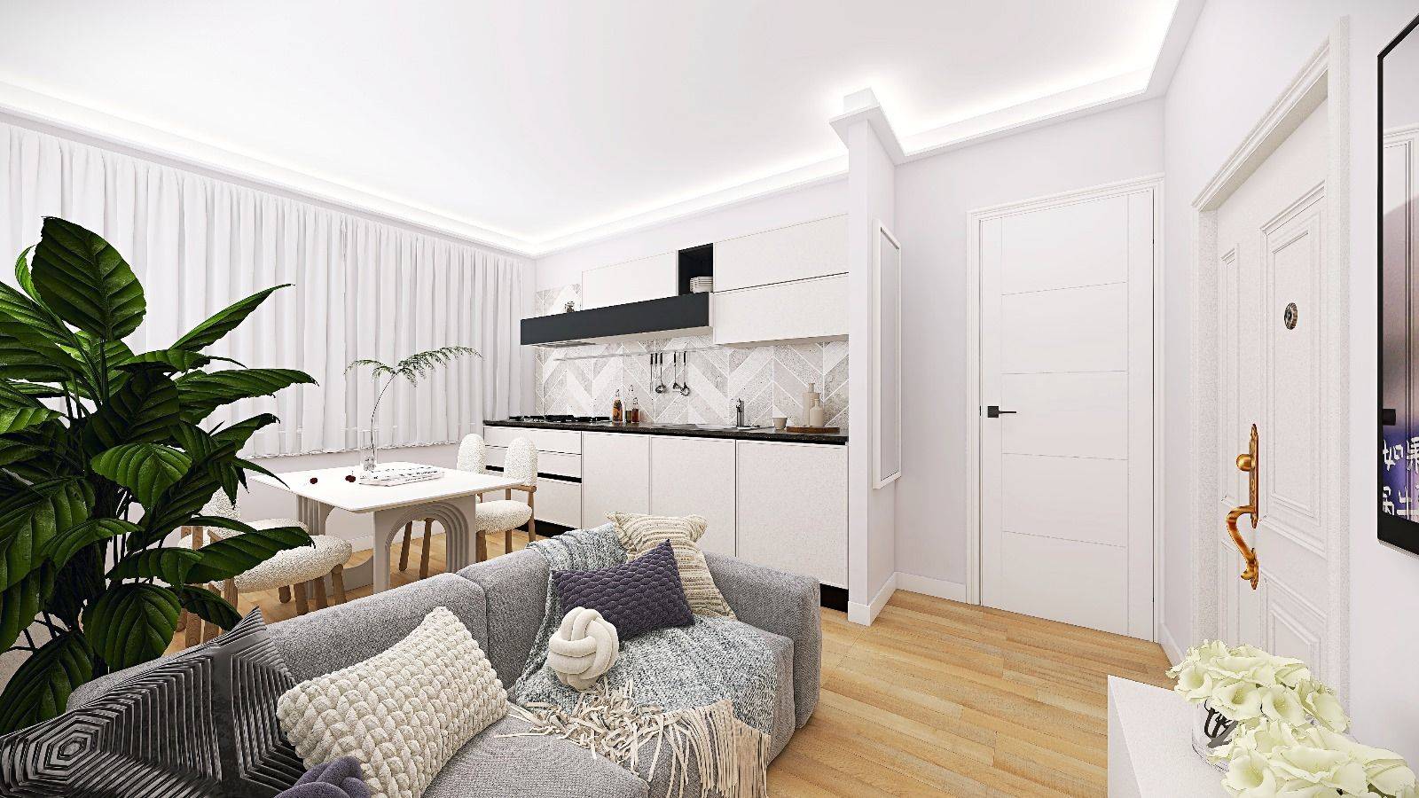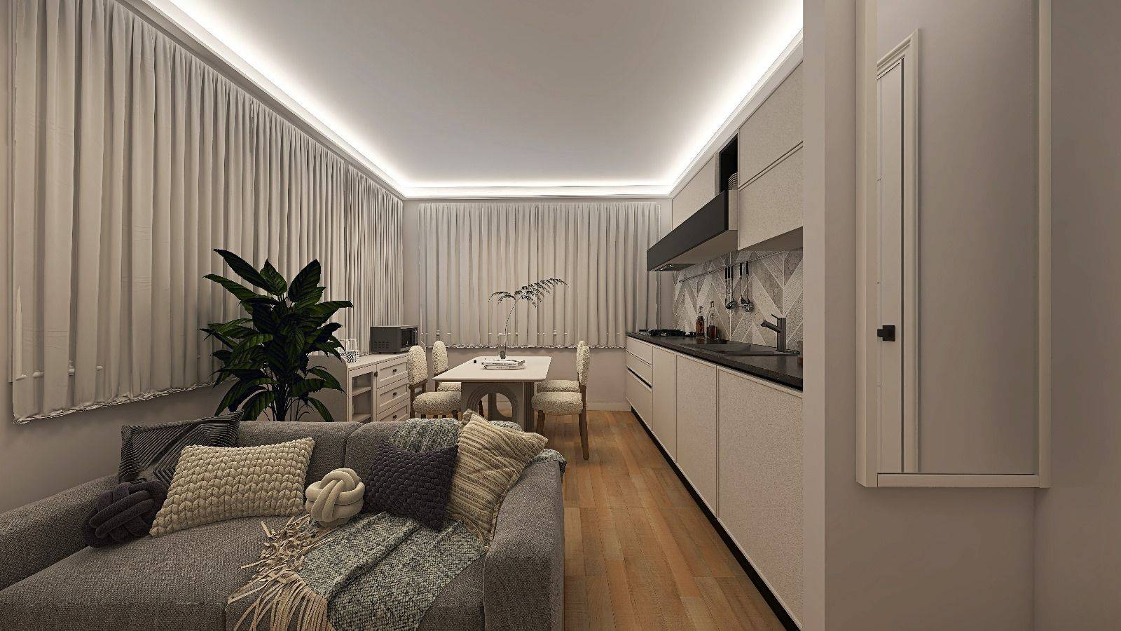 L'appartamento è composto da soggiorno con cucina a vista, camera matrimoniale e bagno.